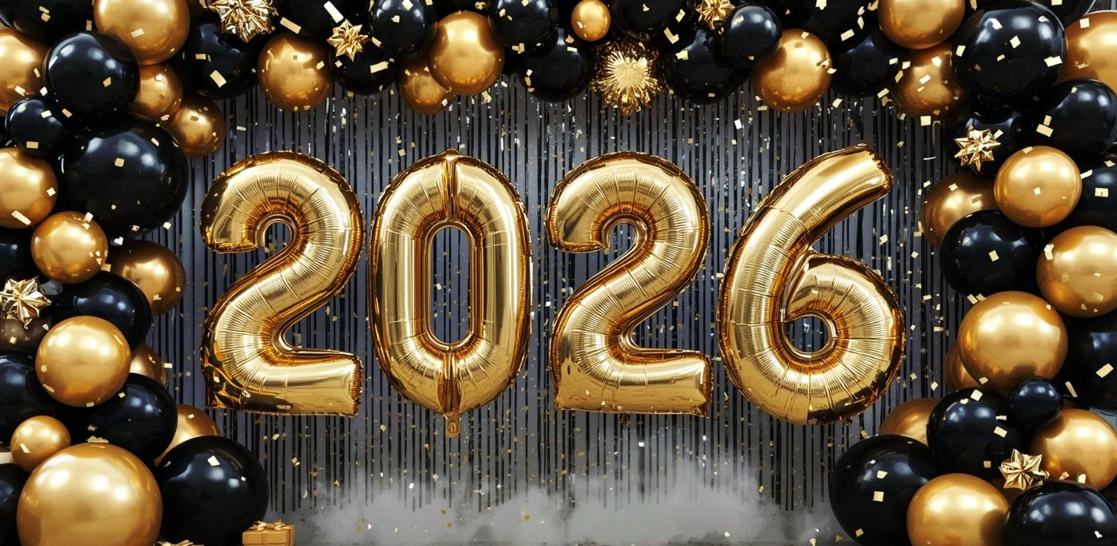 Decoraciones de celebración de Año Nuevo 2025 con globos dorados, negros y plateados en el techo y un cartel que dice 'Feliz Año Nuevo' y '2025' con fuegos artificiales.